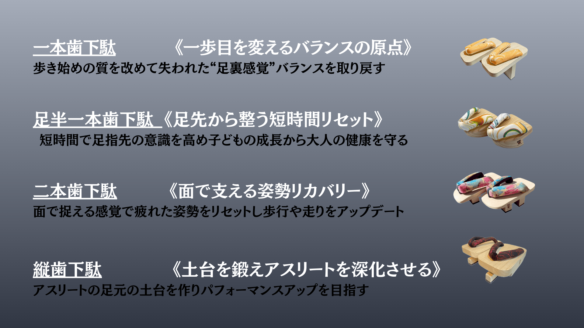 平安時代から日本人の足元を支えてきた一本歯下駄を皮切りに、成長期のお子さん、マタニティー、高齢者の方まで使える足半一本歯下駄や、アスリート仕様の縦歯下駄、ウォーキングやランナーまで使える二本歯下駄を使って人々の健康をサポートいたします。