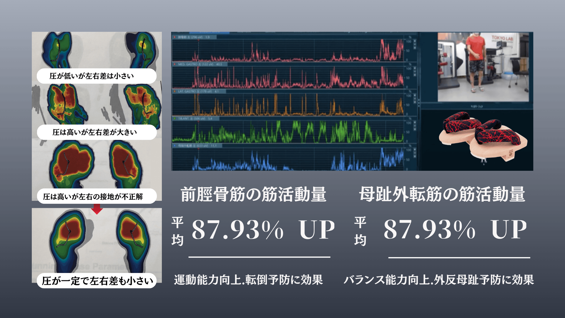 その結果、現代人の生活は頭が重心より前になった姿勢で作業をすることが増えて猫背や腰痛を引き起こし疲れがたまりやすくなっており身体が前に傾くことを防ぐ運動が重要だと考えています。また足裏の筋肉が弱いと転倒のリスクも高まりますので正しい足裏の使い方を日常的にサポートできるように『感覚とエビデンスの融合』をさせた下駄を開発してます。